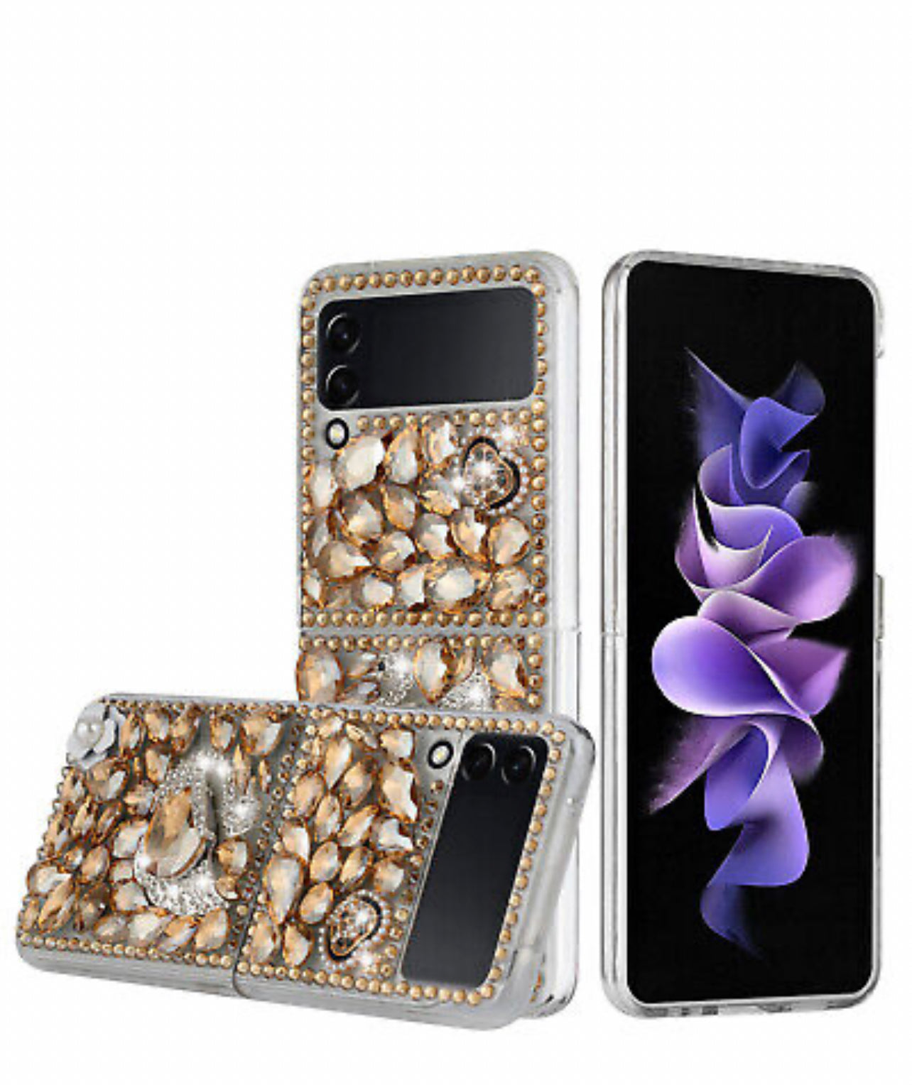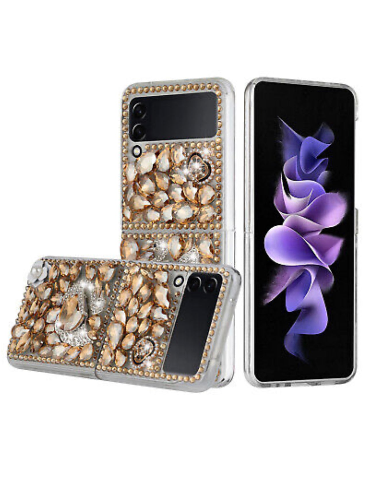 Samsung Galaxy Z Flip3 3D Full Diamond Bling Case Gold Swan Crown Pearl